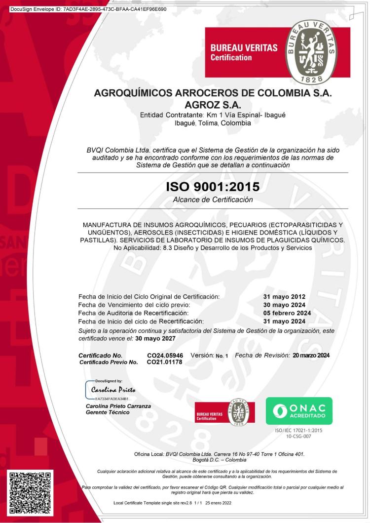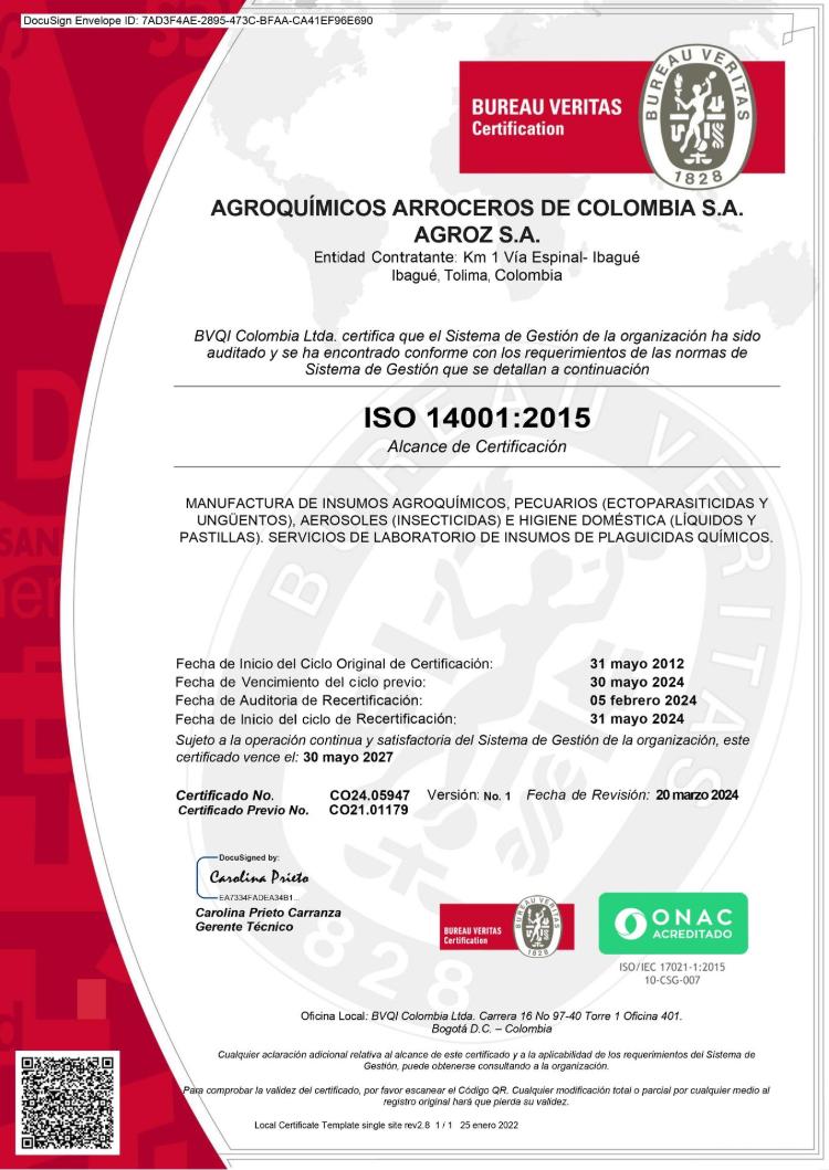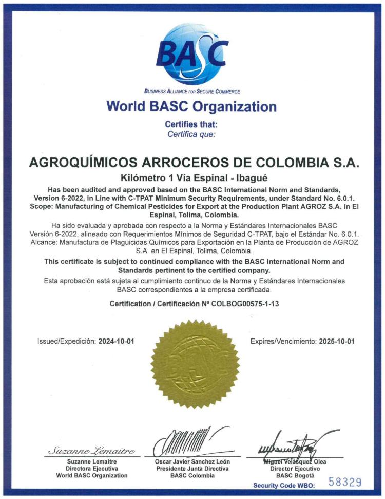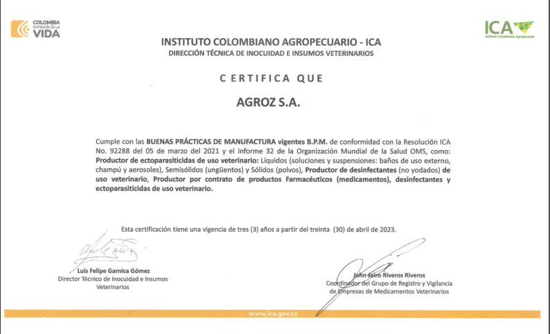 EXPORTADOR. CON EL ALCANCE: MANUFACTURA DE PLAGUICIDAS QUÍMICOS PARA EXPORTACIÓN DE LA PLANTA DE PRODUCCIÓN DE AGROZ S.A. EN EL ESPINAL, TOLIMA, COLOMBIA.